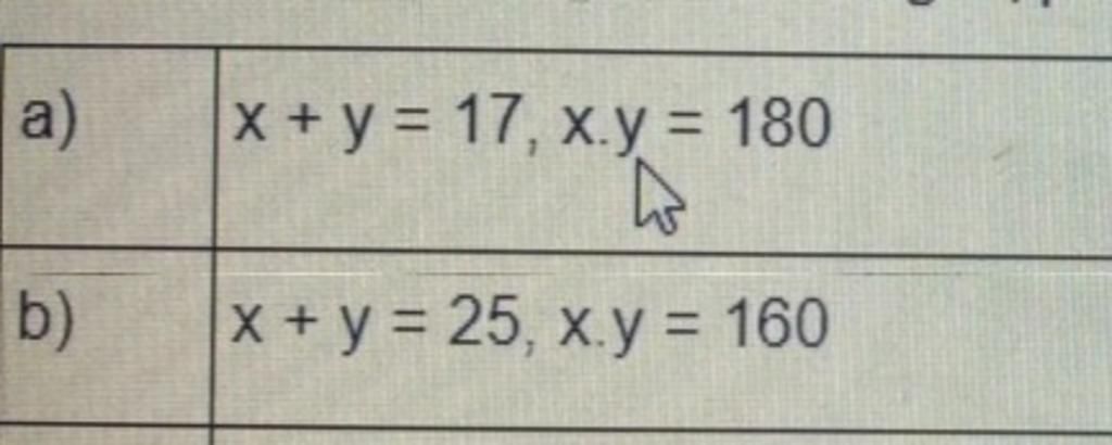 `b)` $\begin{cases}x+y=25\\xy=160\end{cases}$