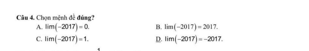 Chọn D vì lim của 1 hằng số = chính nó