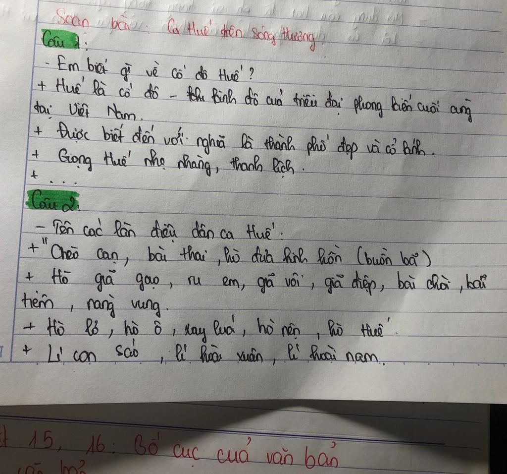 Câu 1:Cố đô Huế là thành phố đẹp và cổ kính bên bờ sông Hương. Trong chương trình Ngữ văn đã có câu ca dao về xứ Huế: "Đường vô xứ Huế quanh quanh - Non xanh nước biếc như tranh hoạ đồ - Ai vô xứ Huế thì vô...". Đặc điểm của xứ Huế là Huế đẹp và Huế thơ, Huế mộng mơ. Giọng Huế dịu dàng. Người xứ Huế thanh lịch. Huế nổi tiếng với cung điện, lăng tẩm, núi Ngự, sông Hương, chùa Thiên Mụ,...