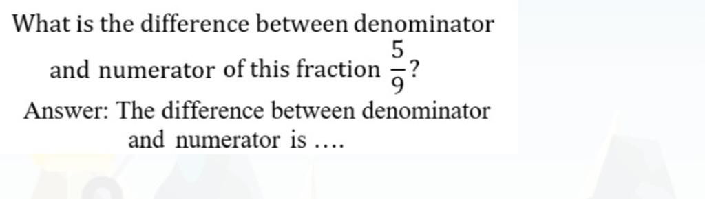 Dịch : Hiệu giữa mẫu số và tử số của phân số `5/9` là bao nhiêu ?