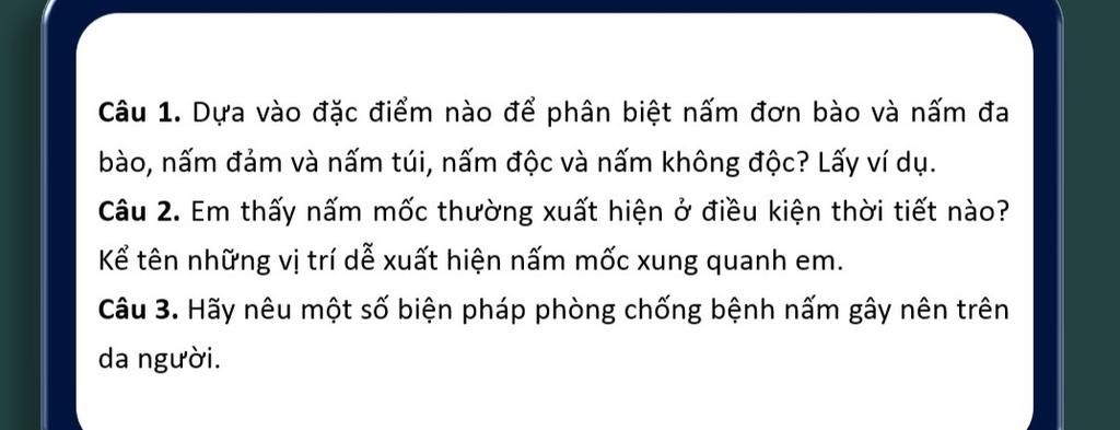 Câu 1: Dựa vào đặc điểm nào để phân biệt nấm đơn bào và nấm đa bào, nấm đảm và nấm túi, nấm độc và nấm không độc? Lấy ví dụ