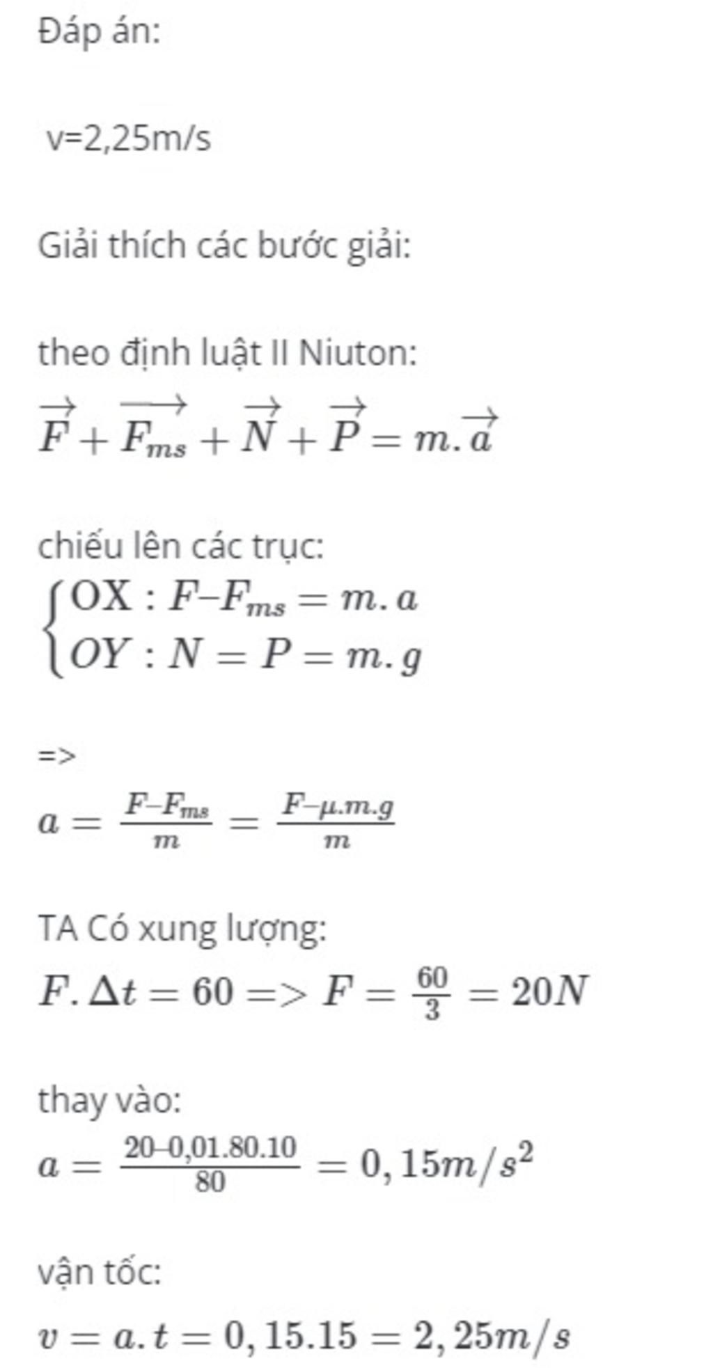 F\Delta t = 60 \Rightarrow F = \dfrac{{60}}{3} = 20\left( N \right)\\