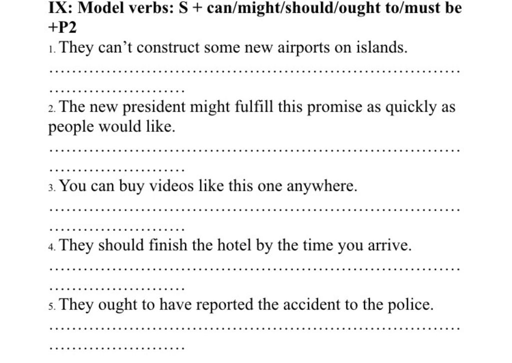 `+` Bị động modal verbs : S + modal verbs + be + V3/ed + (by O)