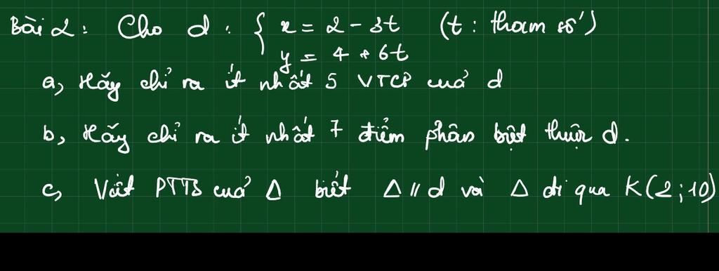 Nên PTTS là $\begin{cases}x=2-3t\\y=10+6t\end{cases}$