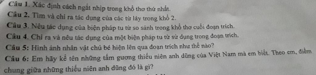 Câu 1: Ngày Huế/ đổ máu Chú/ Hà Nội về Tình cờ/ chú cháu Gặp nhau/ Hàng Bè Câu 2: loắt choắt, thoăn thoắt, nghênh nghênh Tác dụng: Tăng sức gợi hình, gợi cảm, tạo nhịp điệu cho khổ thơ Nhấn mạnh dáng vẻ nhanh nhẹn hồn nhiên, ngây thơ của chú bé Tình cảm yêu quý, trân trọng tác giả dành cho chú bé Câu 3: Mồm huýt sáo vang/ Như con chim chích Tác dụng: Tăng sức gợi hình, gợi cảm, tạo nhịp điệu cho khổ thơ Nhấn mạnh sự hồn nhiên, tinh nghịch, náo nức của chú bé Tình cảm yêu quý, trân trọng tác giả dành cho chú bé Câu 5: Hoán dụ: đổ máu Tác dụng: Tăng sức gợi hình, gợi cảm, tạo nhịp điệu cho khổ thơ Nhấn mạnh sự bi thương mà kẻ thù gây ra cho dân tộc ta Tình cảm chua xót, đau thương của tác giả đối với cảnh đất nước gặp phải những biến cố Câu 5: Tinh nghịch, hồn nhiên, dễ mến, gần gũi, gắn bó Câu 6: Kim Đồng, Lý Tự Trọng.... Điểm chung: còn nhỏ tuổi nhưng rất anh dũng, giàu ý chí và nghị lực quyết tâm Rút gọnCâu 1: Ngày Huế/ đổ máu Chú/ Hà Nội về Tình cờ/ chú cháu Gặp nhau/ Hàng Bè Câu 2: loắt choắt, thoăn thoắt, nghênh nghênh Tác dụng: Tăng sức gợi hình, gợi cảm, tạo nhịp điệu cho khổ thơ Nhấn mạnh dáng vẻ nhanh nhẹn hồn nhiên, ngây thơ của chú b... xem thêm