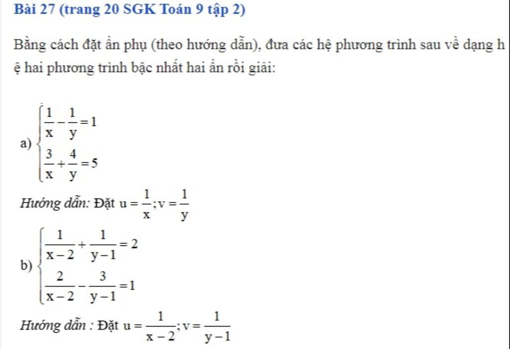 Bằng cách đặt ẩn phụ (theo hướng dẫn), đưa các hệ phương trình sau về dạng h