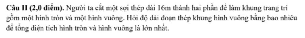 Câu II (2,0 điểm). Người ta cắt một sợi thép dài 16m thành hai phần để làm khung trang trí
