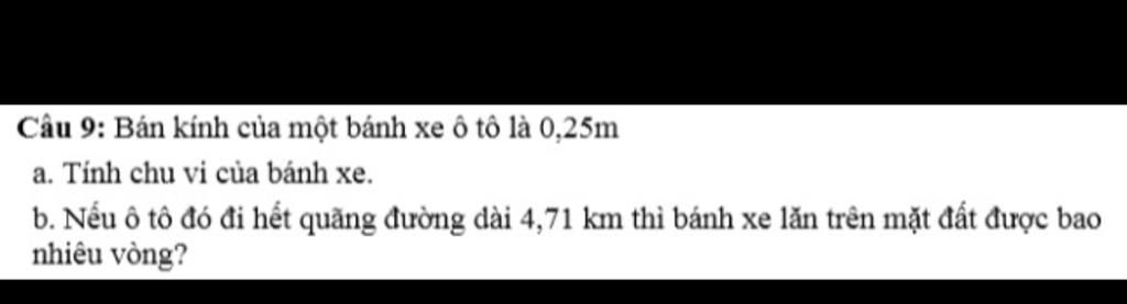 Nếu ô tô đi hết quãng đường ` 4,71 ` ` km ` thì bánh xe lắn được số vòng là: