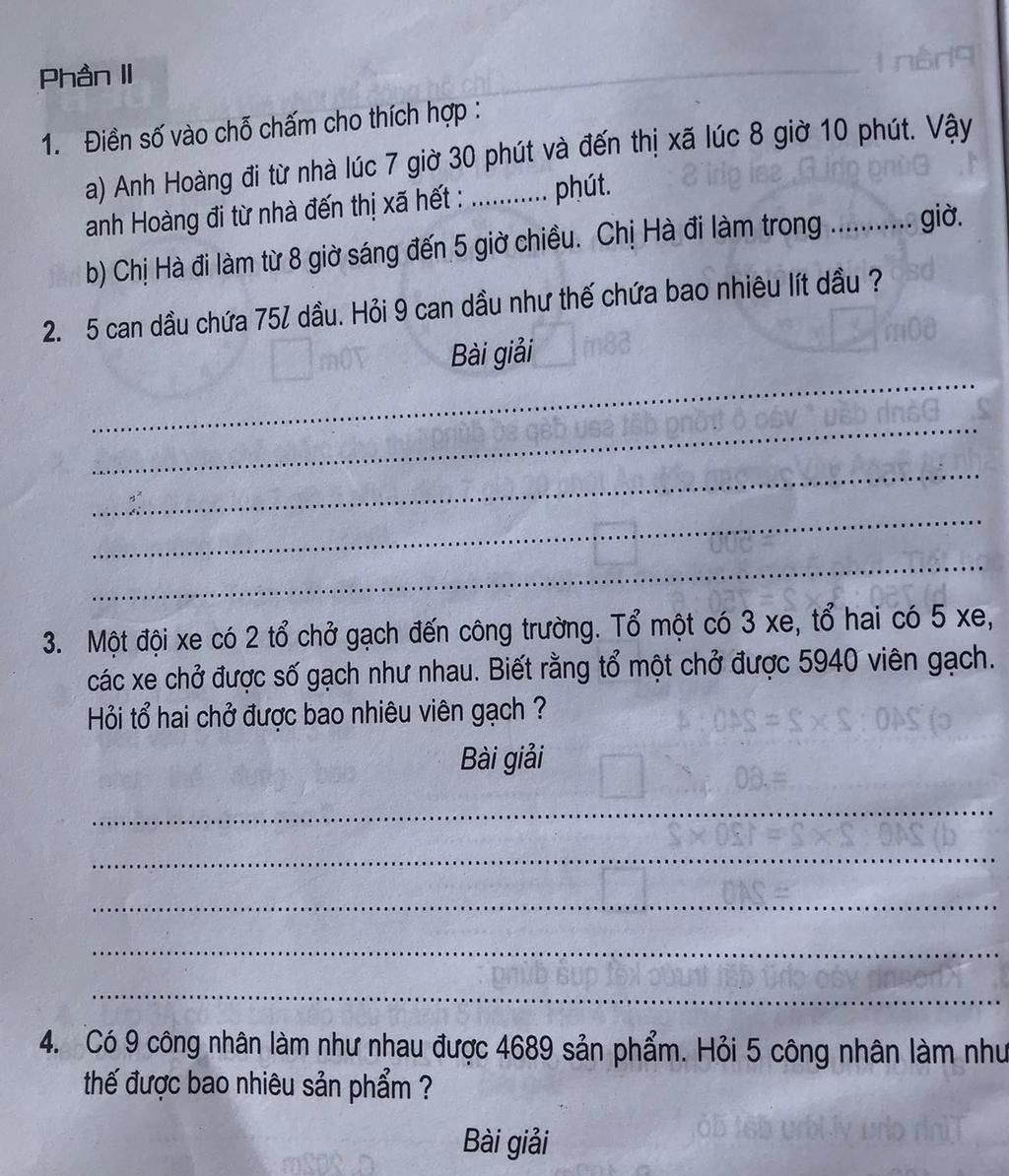 `=>` a) Anh Hoàng đi từ nhà lúc 7 giờ 30 phút và đến thị xã lúc 8 giờ 10 phút. Vây anh Hoàng đi từ nhà đến thị xã hết : `40` phút