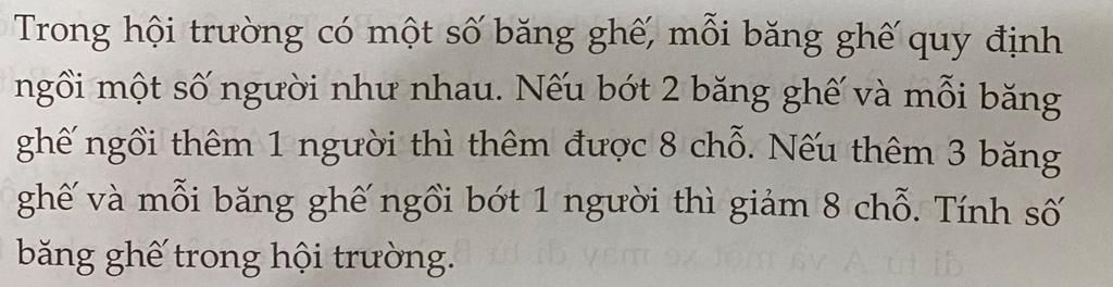 Gọi số ghế băng trong hội trường là x ( x > 0 ) x ( x > 0 ) -Số người ngồi trên mỗi ghế băng là y y => Lúc đầu có x × y x × y (chỗ ngồi) -Bớt 2 ghế thì sẽ còn ( x − 2 ) ( x - 2 ) ghế -Mỗi ghế thêm 1 1 người nên mỗi ghế có ( y + 1 ) ( y + 1 ) người -Lúc này thêm được 8 8 chỗ so với lúc đầu ⇒ ( x − 2 ) ( y + 1 ) = x y + 8 ⇒ ( x - 2 ) ( y + 1 ) = x y + 8 ⇔ x y + x − 2 y − 2 = x y + 8 ⇔ x − 2 y = 10 ( 1 ) ⇔ x y + x - 2 y - 2 = x y + 8 ⇔ x - 2 y = 10 ( 1 ) -Thêm 3 3 ghế băng thì sẽ có ( x + 3 ) ( x + 3 ) ghế -Mỗi ghế rút đi 1 1 người nên 1 1 ghế có ( y − 1 ) ( y - 1 ) người -Vì lúc này hội trường giảm 8 8 chỗ: ⇒ ( x + 3 ) . ( y − 1 ) = x y − 8 ⇒ ( x + 3 ) . ( y - 1 ) = x y - 8 ⇔ x y − x + 3 y − 3 = x y − 8 ⇔ x − 3 y = 5 ( 2 ) ⇔ x y - x + 3 y - 3 = x y - 8 ⇔ x - 3 y = 5 ( 2 ) Giải hệ pt (1) ; (2) ta có : x = 20 ; y = 5 Rút gọnGọi số ghế băng trong hội trường là x ( x > 0 ) x ( x > 0 ) -Số người ngồi trên mỗi ghế băng là y y => Lúc đầu có x × y x × y (chỗ ngồi) -Bớt 2 ghế thì sẽ còn ( x − 2 ) ( x - 2 ) ghế -Mỗi ghế thêm 1 1 người nên mỗi ghế có ( y + 1 ) ( y +... xem thêm