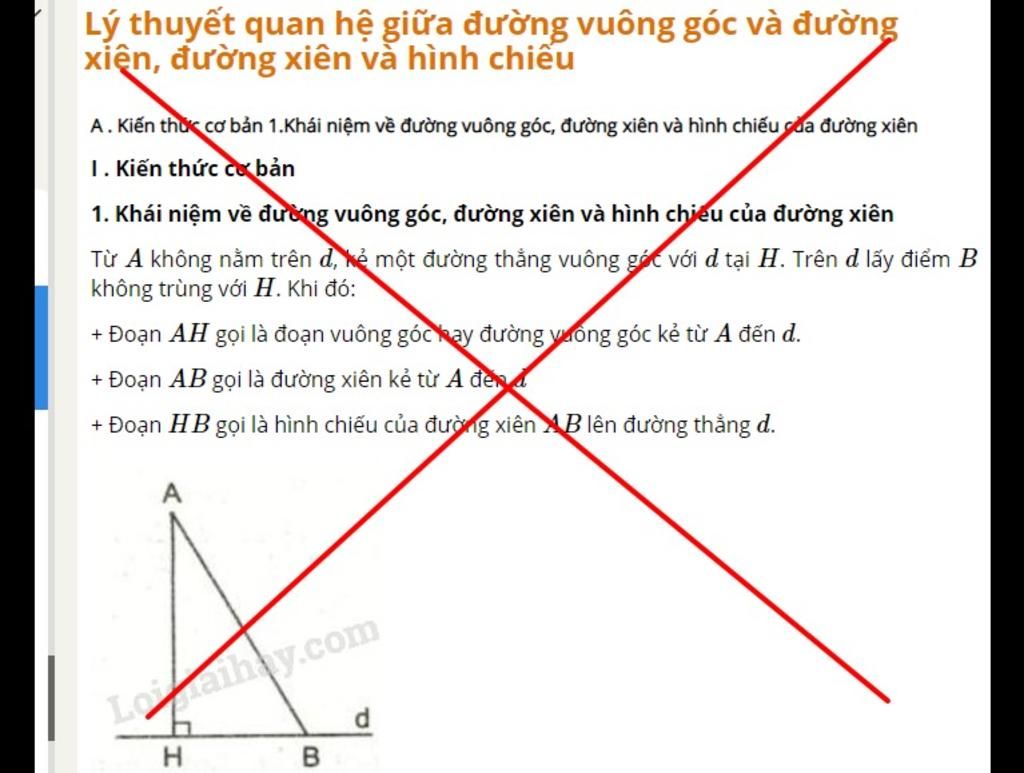 Trong tất cả các đoạn thẳng kẻ từ 1 điểm nằm ngoài một đường thẳng và cắt đường thẳng đó, đoạn vuông góc là đoạn thẳng ngắn nhất và duy nhất. Các đoạn thẳng còn lại được gọi là đường xiên.
