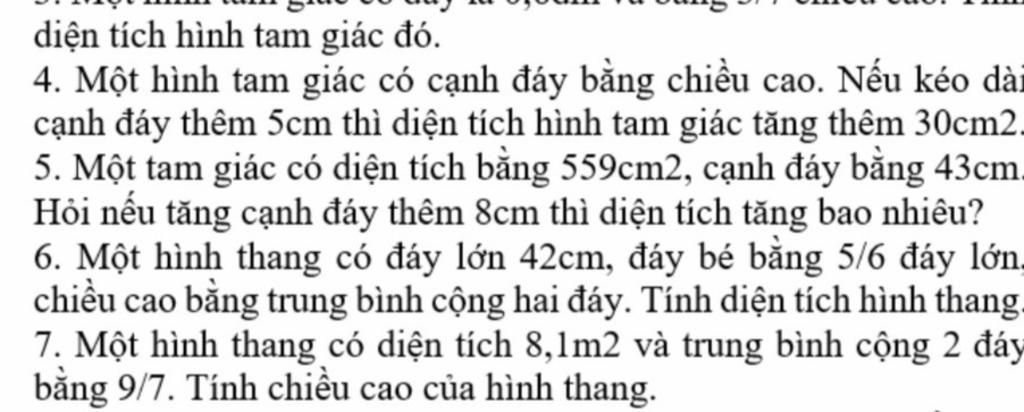4 Chiều cao của tam giác là: 30 x 2 : 5 = 12 ( cm ) Diện tích của tam giác ban đầu là: 12 x 12 : 2 = 72 ( cm2 ) Đáp số 72 cm2 5 Chiều cao hình tam giác là 559 :2 x 43 = 26 cm Cách đáy mới là 43+8=51 cm DT hình tam giác mới là 51x26:2=663 cm2 Nếu tăng thêm cạnh đáy 8 cm thì diện tích tăng thêm là 663-559=104 cm2 D/S 104 cm2 6 Đáy bé hình thang là: 42:6×5=35 (cm) Trung bình cộng hai đáy hay chiều cao của hình thang là: (42+35):2=38,5 (cm) Diện tích hình thang là: 38,5×38,5=1482,25cm2) Đáp số1482,25 cm2 7 Tổng hai đáy của hình thang đó là: 9797 x 2 = 187187 (m) Chiều cao của hình thang là: 8,1 : 187187 : 1212 = 6,3 (m) D/S 6/3 m Cho mình xin câu chả lời hay nhất Rút gọn4 Chiều cao của tam giác là: 30 x 2 : 5 = 12 ( cm ) Diện tích của tam giác ban đầu là: 12 x 12 : 2 = 72 ( cm2 ) Đáp số 72 cm2 5 Chiều cao hình tam giác là 559 :2 x 43 = 26 cm Cách đáy mới là 43+8=51 cm DT hình tam giác mới là 51x26:2=663 ... xem thêm