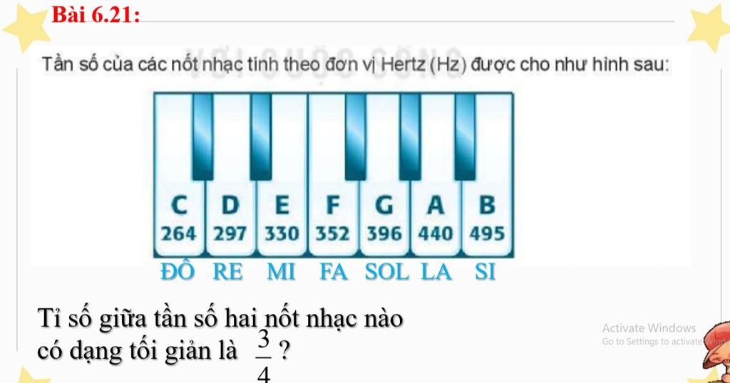 Vậy tần số giữa tần số hai nốt nhạc `E` và `A` có dạng tối giản là `3/4`.