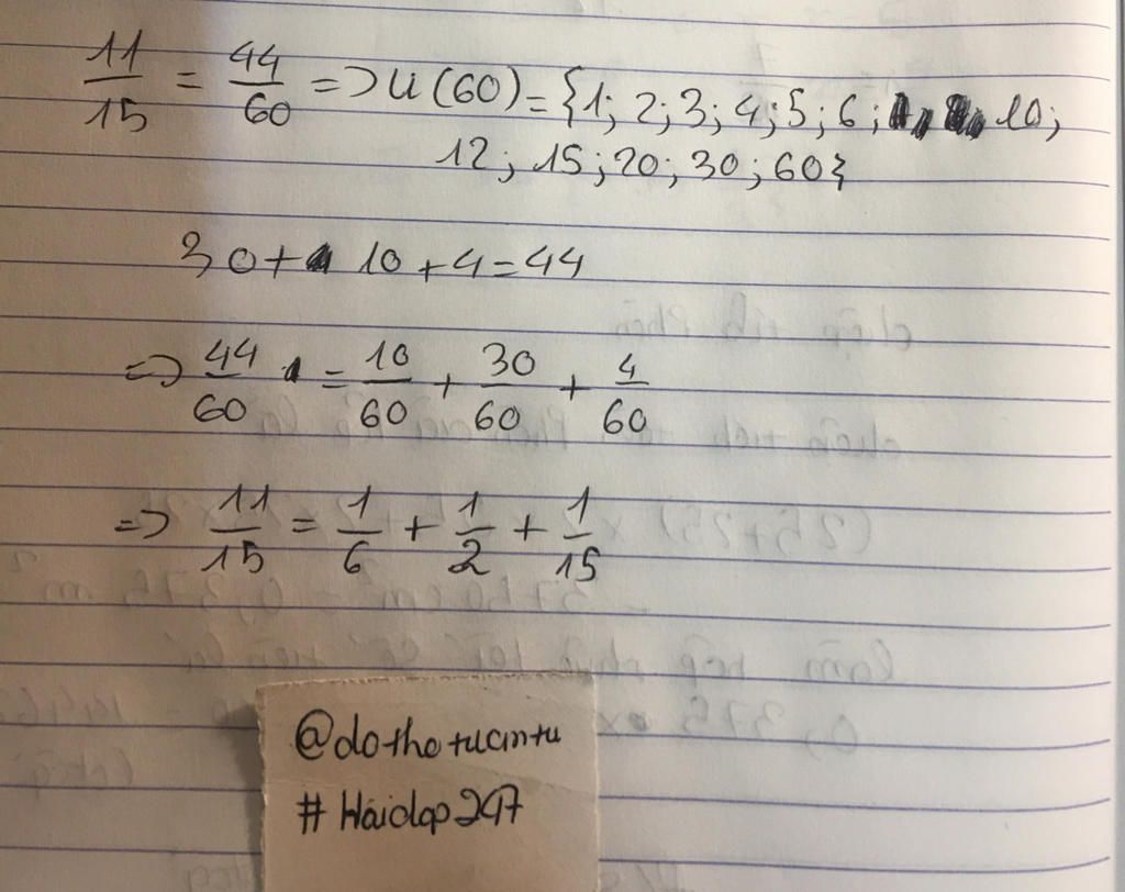 Vậy `11/15 = 1/30 + 1/2 + 1/5`
