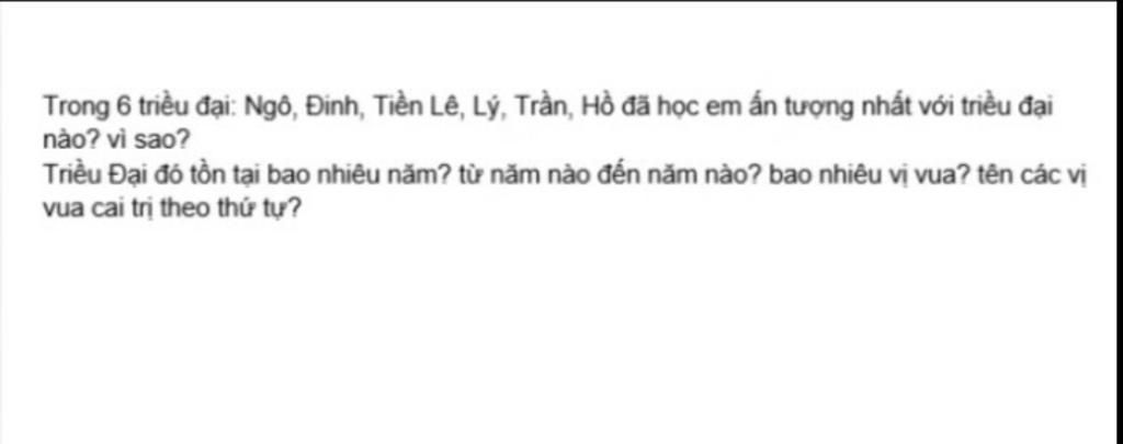 `-` Trong `6` triều đại: Ngô, Đinh, Tiền Lê, Lý, Trần, Hồ đã học em ấn tượng nhất với triều đại nhà Tiền Lê. Bởi nhà Tiền Lê đã thành lập từ những ngày nước ta buổi đầu độc lập và đánh tan quân xâm lược Tống khẳng định quyền làm chủ đất nước, củng cố nền độc lập dân tộc, đồng thời thể hiện một bước phát triển của đất nước.