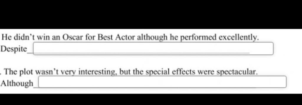 1.Despite his excellent performance/the fact that he performed excellently, he didn't win an Oscar for the Best Actor.