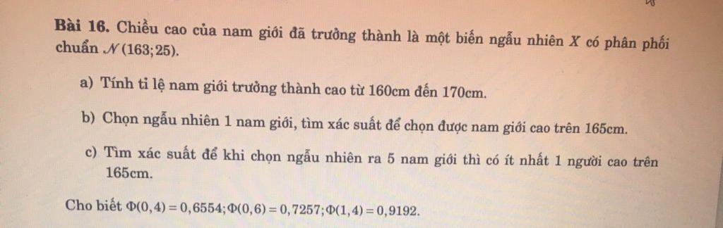 c) Gọi $Y$ là số người cao trên $165\ cm$ trong $5$ nam giới được chọn. $Y = 0,1,2,3,4,5.$