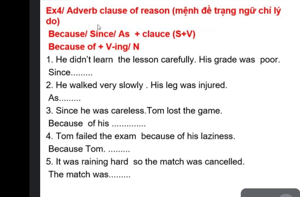 Áp dụng cấu trúc : Because /Since/As + Clauce(mệnh đề ,S+V)