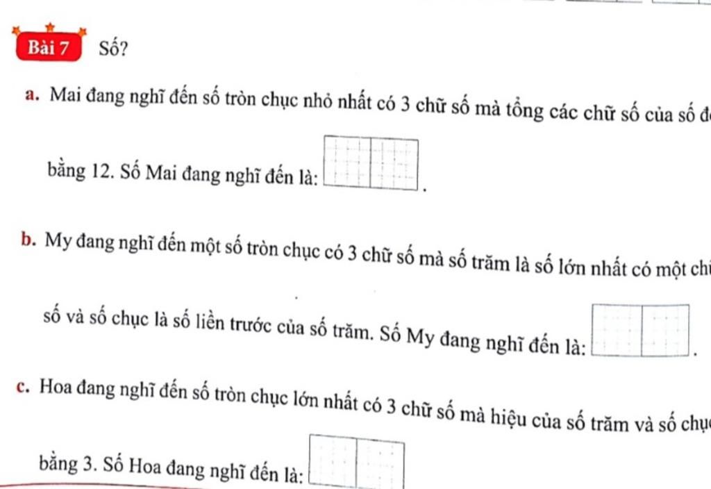 a) Số tròn chục nhỏ nhất có 3 chữ số: 100 mà tổng các chữ số bằng 12 => 129 Bạn cố gắng cho hàng trăm nhỏ nhất, sau đó đến hàng chục và hàng đơn vị nha b) Hàng trăm là số lớn nhất có một chữ số: 9 Hàng chục là số liền trước => số 8 (8 là số liền trước số 9) Mà đây là số tròn chục có 3 chữ số => số 0 Vậy số mà My đang nghĩ đến là: 980 c) Vì: đây là số tròn chục lớn nhất có 3 chữ số => hàng trăm là số 9; hàng đơn vị bằng 0 Mà: hiệu của số trăm và số chục bằng 3 => Ta có: 9-x=3 => x= 9-3=6 Vậy số mà Hoa đang nghĩ đến là 960 Rút gọna) Số tròn chục nhỏ nhất có 3 chữ số: 100 mà tổng các chữ số bằng 12 => 129 Bạn cố gắng cho hàng trăm nhỏ nhất, sau đó đến hàng chục và hàng đơn vị nha b) Hàng trăm là số lớn nhất có một chữ số: 9 Hàng chục là số liền trước => số 8 (8 là số liền tr... xem thêm