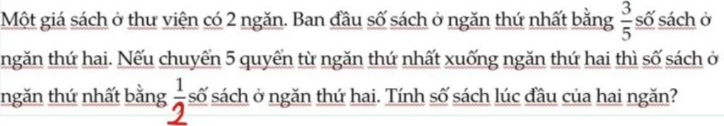 Sau khi chuyển 5 quyển từ ngăn thứ nhất xuống ngăn thứ hai thì số sách ở ngăn thứ nhất chiếm số phần số sách ở cả hai ngăn là: 1 : ( 1 + 2 ) = 1/3 ( số sách ở cả hai ngăn )