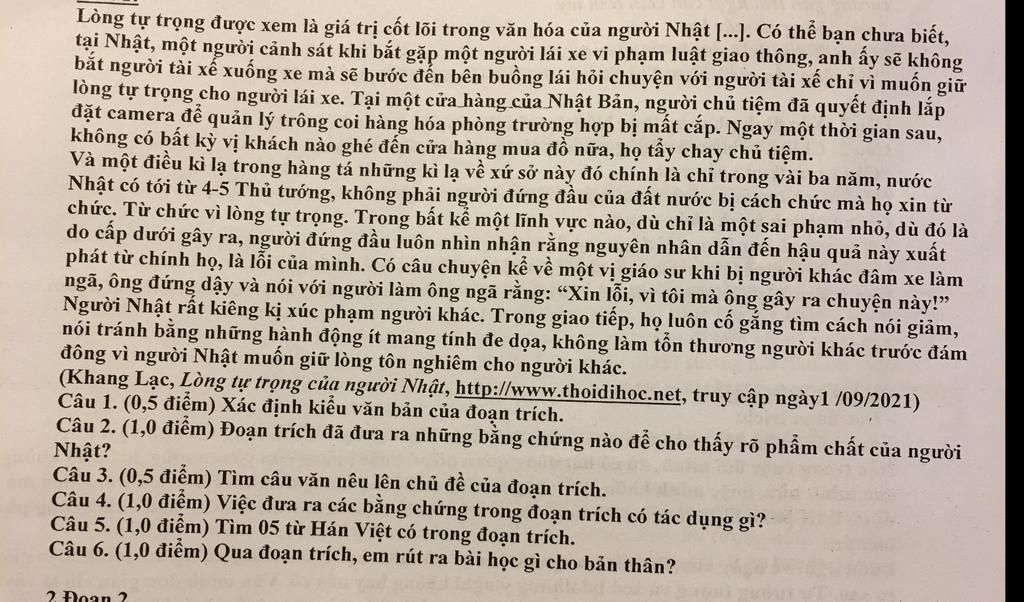 Câu 3: Lòng tự trọng được xem là giá trị cốt lõi trong văn hóa của người Nhật