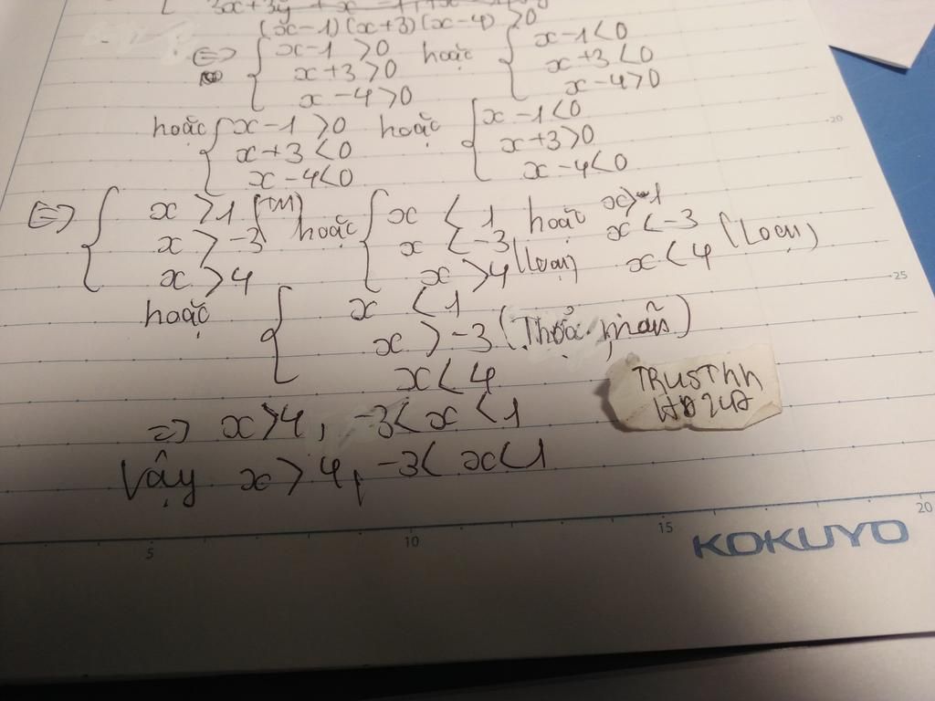 Vậy `-3<x<1` và `x>4`