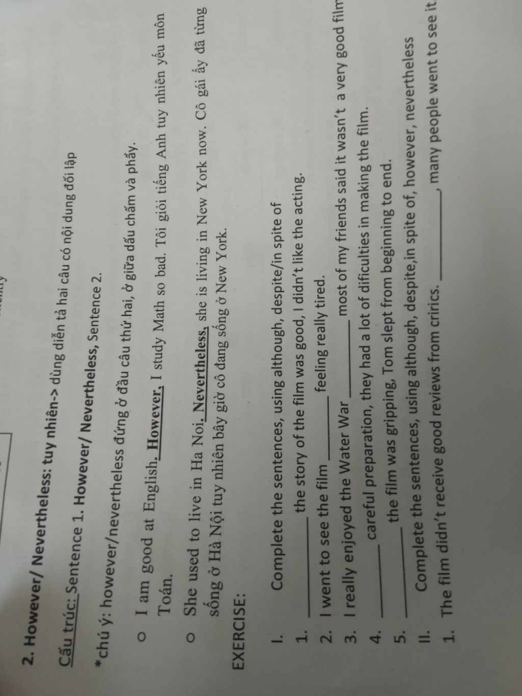 II. 1.However / 2.Despite / 3.However / 4.Althought / 5.Althought