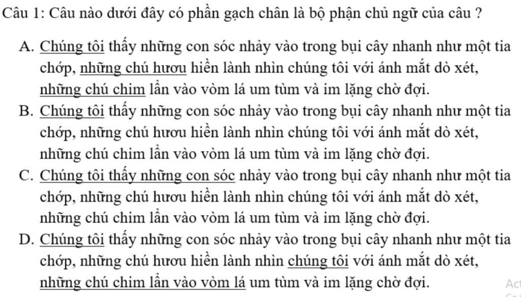 Đáp án `C` sai vì phần gạch chân đã gạch cả một phần vị ngữ, thiếu chủ ngữ "những chú hươu" và "những chú chim".