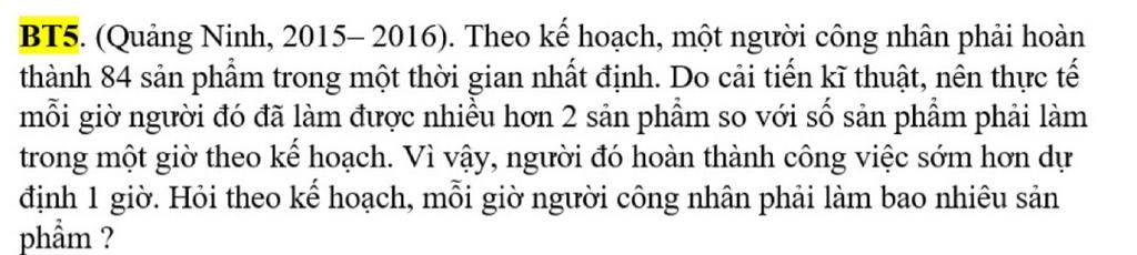 Gọi x là số sản phẩm mỗi giờ mà người công nhân phải hoàn thành theo kế hoạch (x ∈ ℕ * , x < 84)