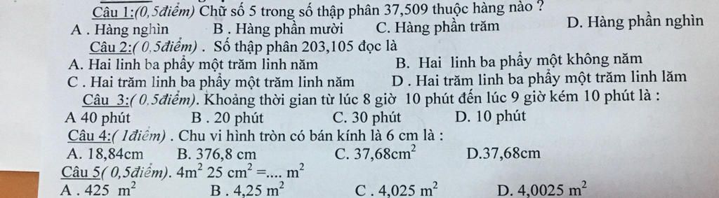 Câu 5: D (Mẹo nhỏ: nếu chuyển từ đơn vị nhỏ sang đơn vị lớn hoặc ngược lại thì ta chỉ cần dịch chuyển dấu phẩy từ pk sang trái hoạc ngược lại . )