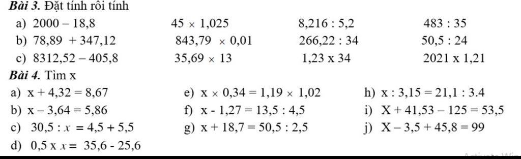 a) x + 4,32 = 8,67 e) x x 0,34 = 1,19 x 1,02 h) x chia 3,15 = 21,1 chia 3,4