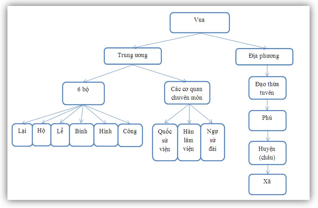 - Giúp việc cho vua có các quan đại thần. Ở triều đình có sáu bộ : Lại, Hộ, Lễ, Binh, Hình, Công. Ngoài ra, còn có một số cơ quan chuyên môn như Hàn lâm viện (soạn thảo công văn), Quốc sử viện (viết sử), Ngự sử đài (can gián vua và các triều thần).