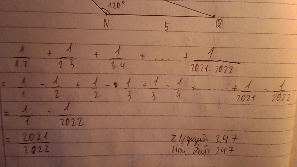 Vậy `1/(1xx2) + 1/(2xx3) + 1/(3xx4) + ... + 1/(2021 xx 2022) = 2021/2022`