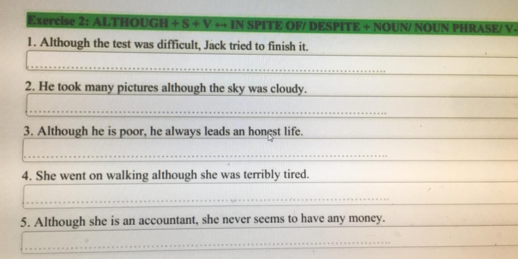 1. In spite of/Despite the difficult test, Jack tried to finish it.
