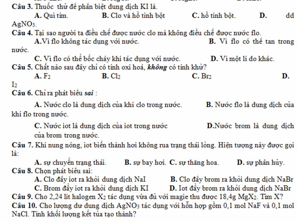 Câu 8: $D$ (iot không thể đẩy halogen)