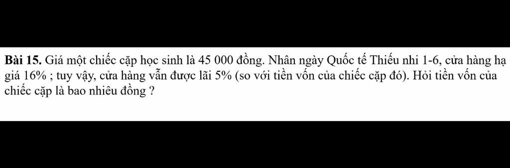 Giá bán của chiếc cặp sau khi hạ giá là`:`$\\$ `45000 -45000 : 100 x 16 = 37800` `(`đồng`)`$\\$ Tỉ số phần trăm của số tiền bán và số tiền vốn là`:`$\\$ `5% + 100% = 105% (`tiền vốn`)`$\\$ Vì số tiền bán là `37 800` đồng nên số tiền vốn là`:`$\\$ `37800 : 105 xx 100 = 36000 (`đồng) $\\$ Đáp số`: 36 000` đồng`.`