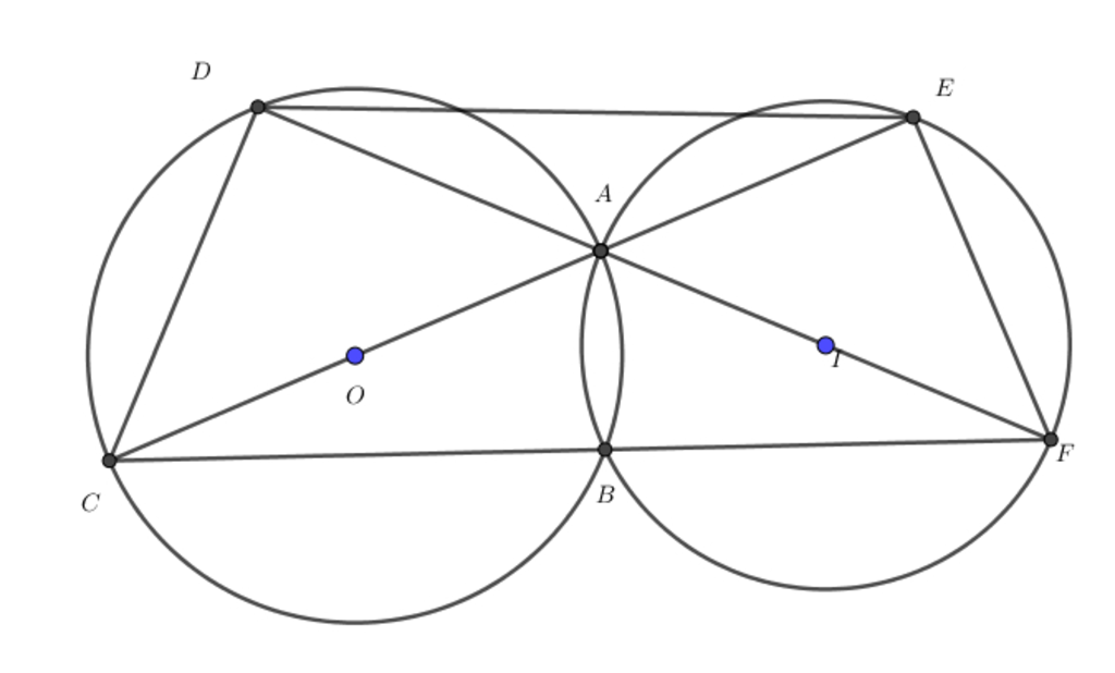 Cho hai đường tròn (O;R1) và (O;R2) cắt nhau tại A và B. Các đường thẳng AO và AI cắt (O) lần lượt tại các điểm thứ hai là C và D, đồng thời cắt (I) lần lượt tại các điểm thứ hai là E và F.