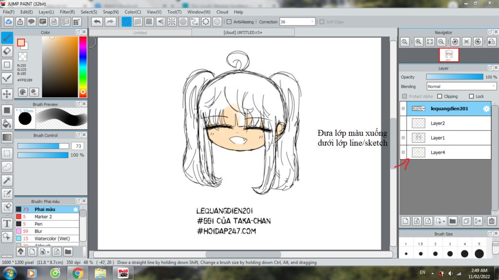 Đưa lớp màu xuống dưới lớp sketch/line(pic 1,3), sau đó tẩy đi phần màu thừa(pic 2,4)