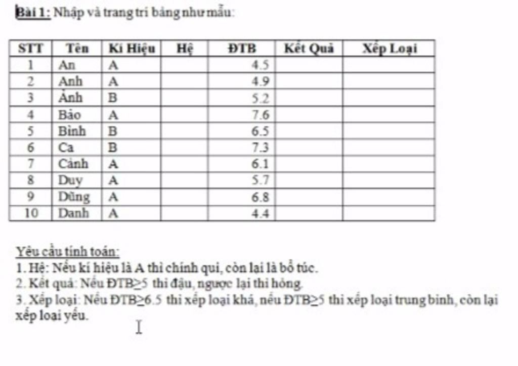 Bài 1: Nhập và trang tri bảng như mẫu: