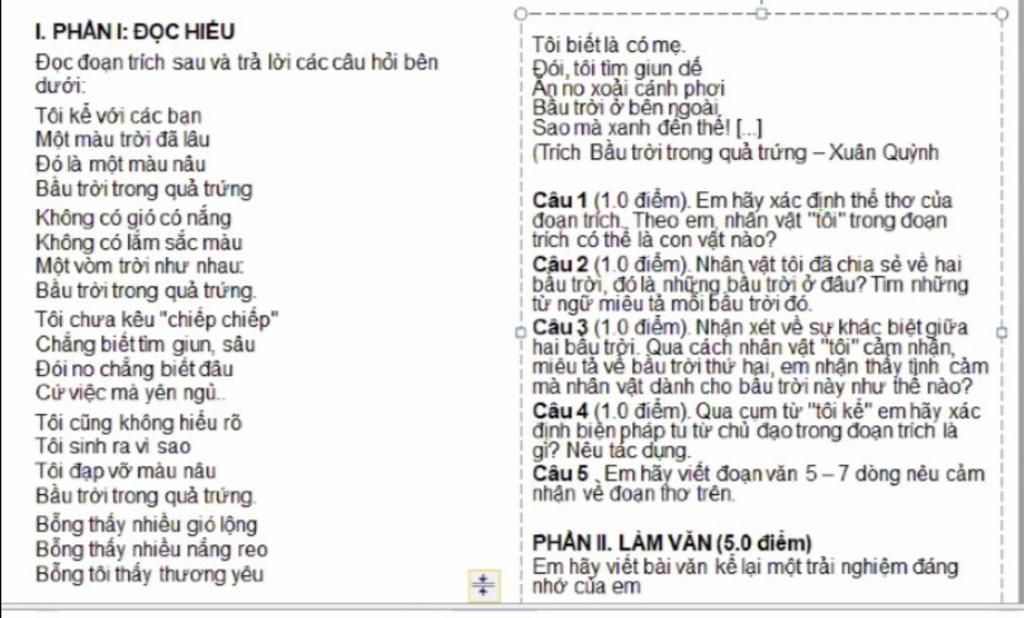Câu 1: Thể thơ: Thơ 5 chữ - Nhân vật tôi trong câu chuyện: Chú gà con Câu 2: Có hai bầu trời - Bầu trời thứ nhất: ở trong vỏ trứng ∘ : có một màu nâu; không có gió, có nắng; không có sắc màu. - Bầu trời thứ hai: bầu trời tự do ∘ :nhiều gió lọng, nắng reo Câu 3: * Nhận xét về sự khác biệt: + Bầu trời thứ nhất: chỉ có một màu nâu; không có gió, có nắng; không có sắc màu. + Bầu trời thứ hai: nhiều gió lọng, nắng reo * Em cảm nhận tình cảm mà nhân vật dành cho bầu trời là: tình cảm yêu quý, thương yêu vô cùng nhưng pha lẫn một sự mới mẻ, lạ lẫm. Nhân vật tôi như muốn dành cả trái tim yêu thương về bầu trời trong xanh, mới mẻ này Câu 4: BPTT: Nhân hóa - Nhân hóa chú gà con thành người kể chuyện ⇒ Tác dụng: tăng sức gợi hình, gợi cảm cho diễn đạt. Làm cho thế giới đồ vật trở nên gần gúi với con người. Kể lại những tâm tư, suy nghĩ của chú gà con Rút gọnCâu 1: Thể thơ: Thơ 5 chữ - Nhân vật tôi trong câu chuyện: Chú gà con Câu 2: Có hai bầu trời - Bầu trời thứ nhất: ở trong vỏ trứng ∘ : có một màu nâu; không có gió, có nắng; không có sắc màu. - Bầu trời thứ hai: bầu trời tự do ∘ :nhiều gió lọng, ... xem thêm