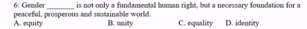 6. Gender _______ is not only a fundamental human right, but a necessary foundation for a peaceful, prosperous and sustainable world.