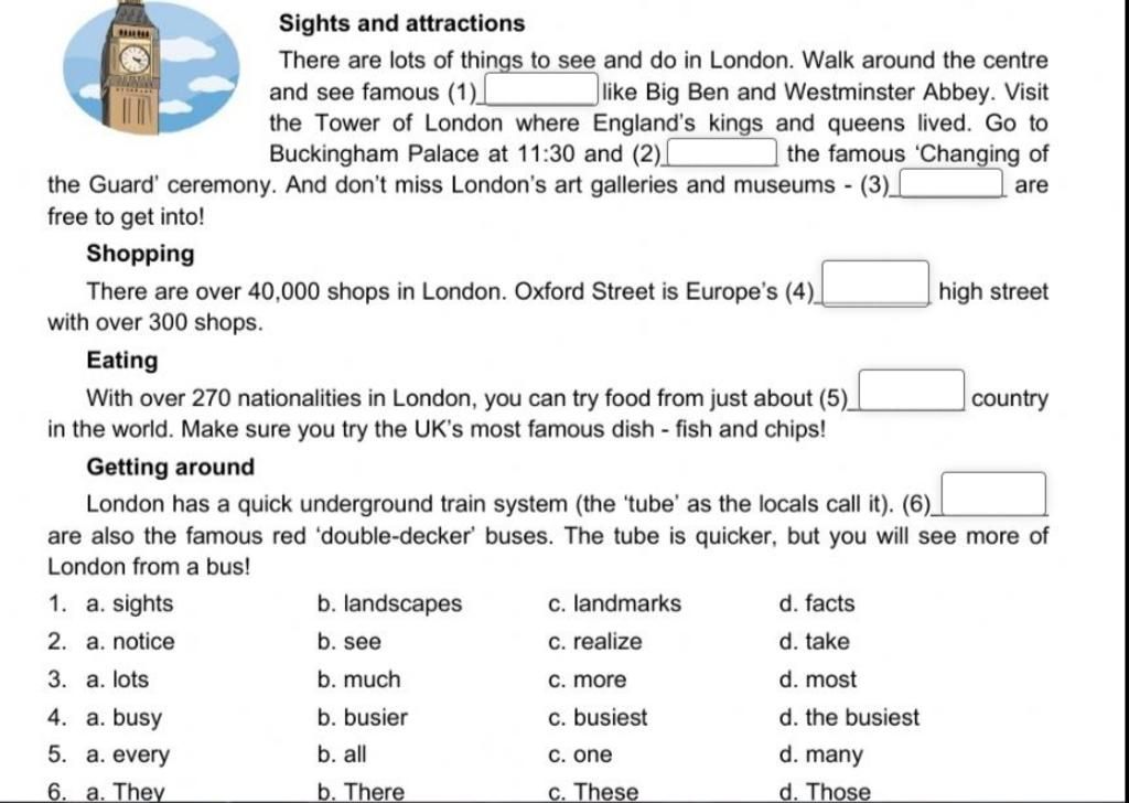 `1.` C (đi bộ quanh khu trung tâm và xem các địa danh nổi tiếng như big ben và westminster abbey)