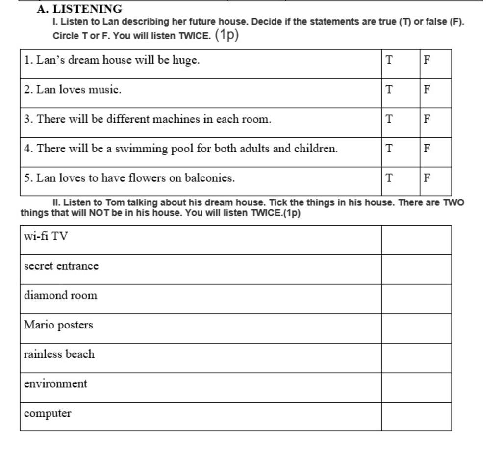 I. Listen to Lan describing her future house. Decide if the statements are true (T) or false (F).