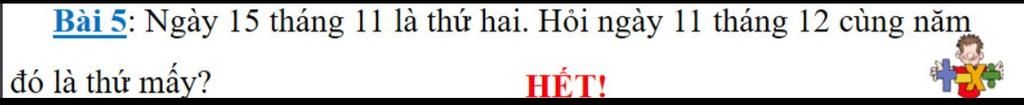 Vì muốn thứ không giữ nguyên thì ta cộng với 1 tuần(tức là 7 ngày) những chỉ khác về ngày chứ không khác thứ mà 15:7=2 dư 1 nên thứ sẽ thay đổi 1 ngày là tương ứng với 1 thứ.=>Ngày 30 tháng 11 sẽ là thứ 3.Bài hỏi cần tìm ngày 11 tháng 12 cũng năm đó là thứ mẫy thì ta làm như trên và ta có kết quả là ngày thứ 7 Đáp số:thứ 7Hãy giúp mọi người biết câu trả lời này thế nào?
