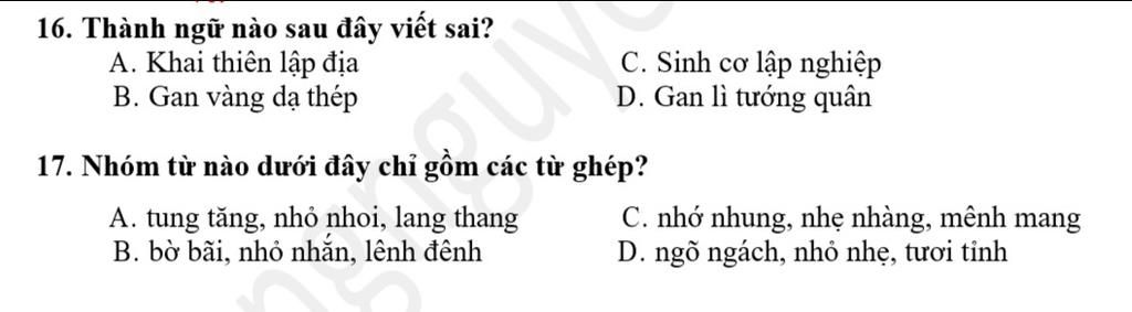 17. Nhóm từ nào dưới đây chỉ gồm các từ ghép?