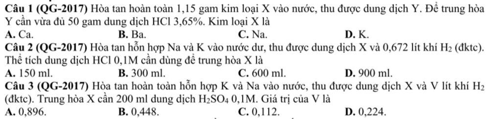 `\text{Câu 1}`: Hòa tan hoàn toàn 1,15 gam kim loại X vào nước thu được dung dịch Y . Để trung hòa Y cần vừa đủ 50 gam dung dịch HCl 3,65%. Kim loại X là:
