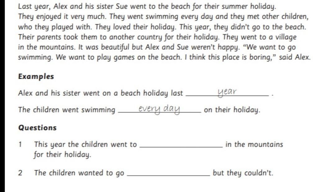 ` 1 ` : This year the children went to a villige in the moutains for their holiday