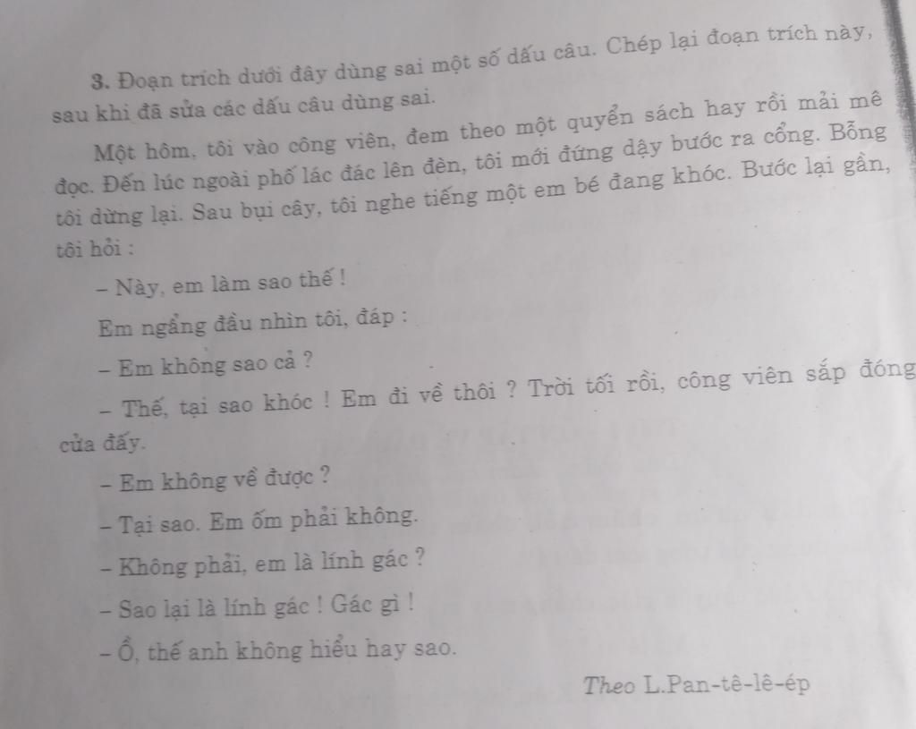 "Một hôm, tôi vào công viên, đem theo một quyển sách hay rồi mải mê đọc. Đến lúc ngoài phố lác đác lên đèn, tôi mới đứng dậy bước ra công. Bỗng tôi dừng lại. Sau bụi cây, tôi nghe tiếng một em bé đang khóc. Bước lại gần, tôi hỏi :