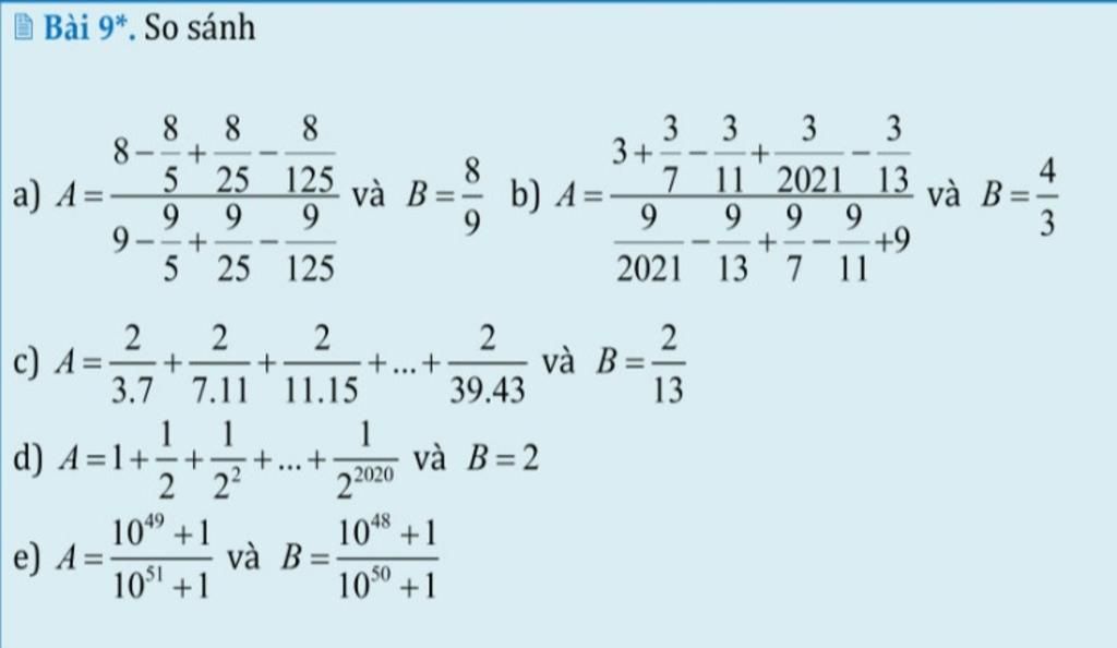 Vì `9/(10^51 + 1) < 9/(10^50 + 1)` nên `100A < 100B` hay `A < B`