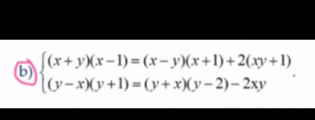 `{((x+y)(x-1)=(x-y)(x+1)+2(xy+1)),((y-x)(y+1)=(y+x)(y-2)-2xy):}`